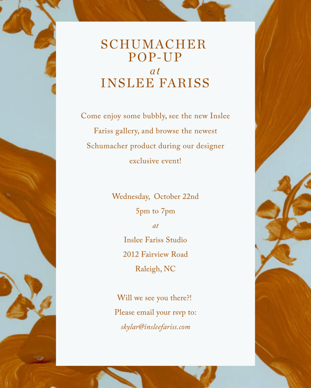 Designer and Trade Members Event. Explore the new studio & shop and browse new Schumacher products.