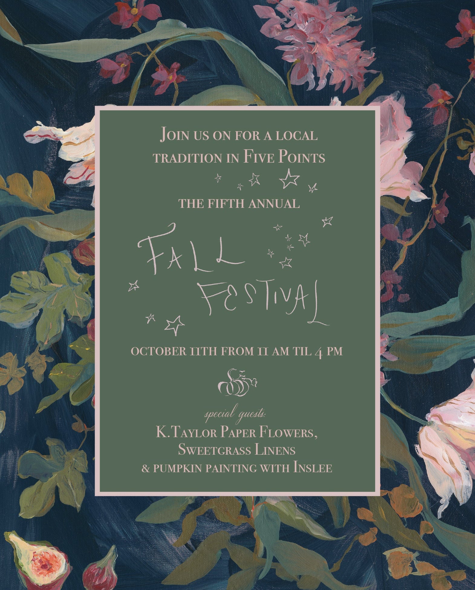 Join us for the 5th annual Fall Festival in Five Points. Stop by The Shop for pumpkin painting with Inslee, paper flowers by K. Taylor and Sweetgrass Linens.